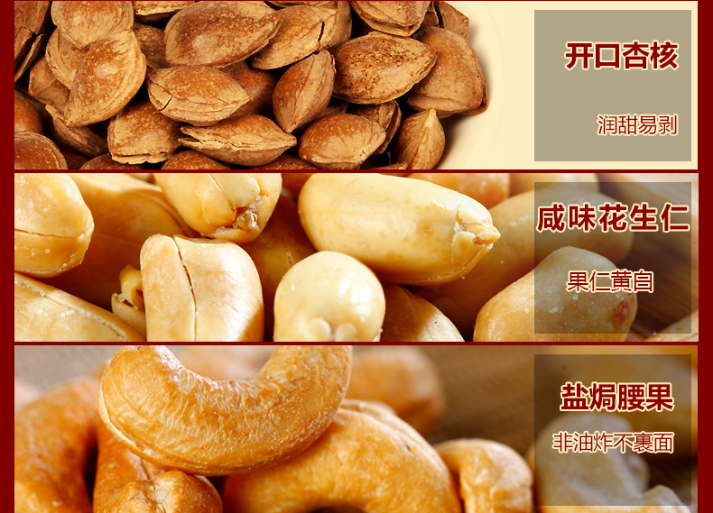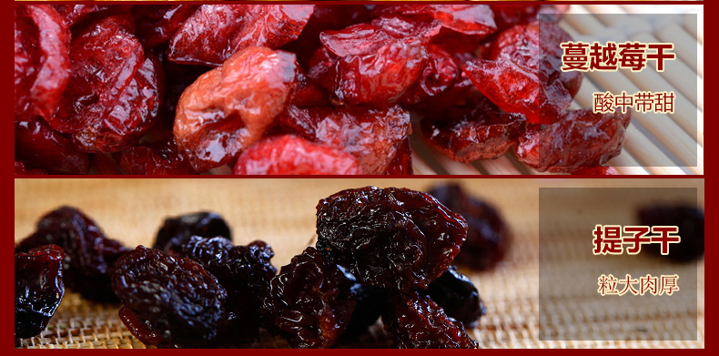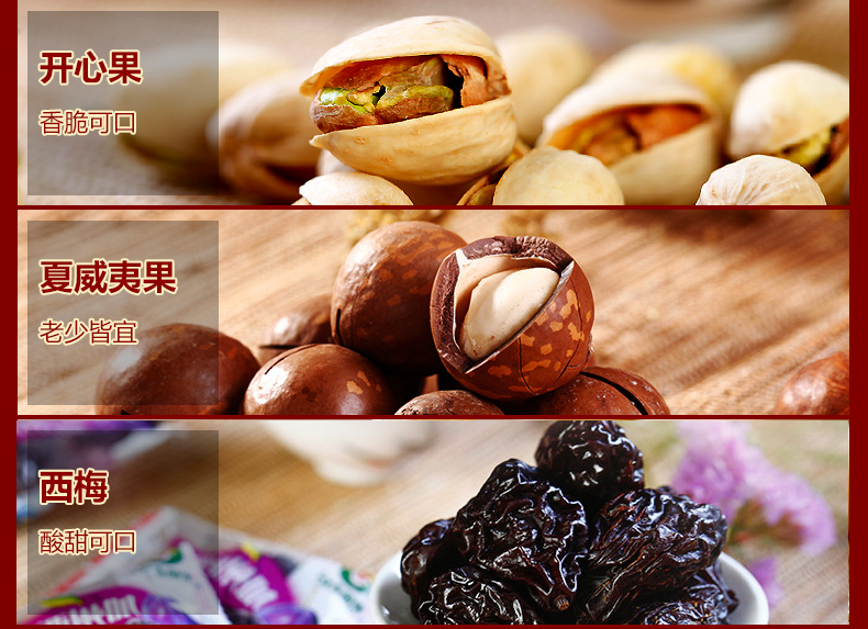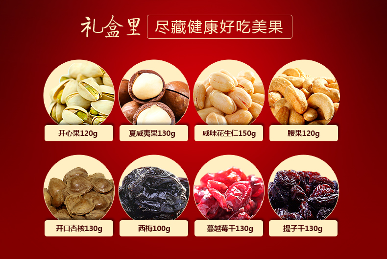 | 内配: | 咸味花生仁150g 夏威夷果130g 北美蔓越莓干130g 南美提子干130g 开口杏核130g 加州开心果120g 腰果仁120g 加州西梅100g |