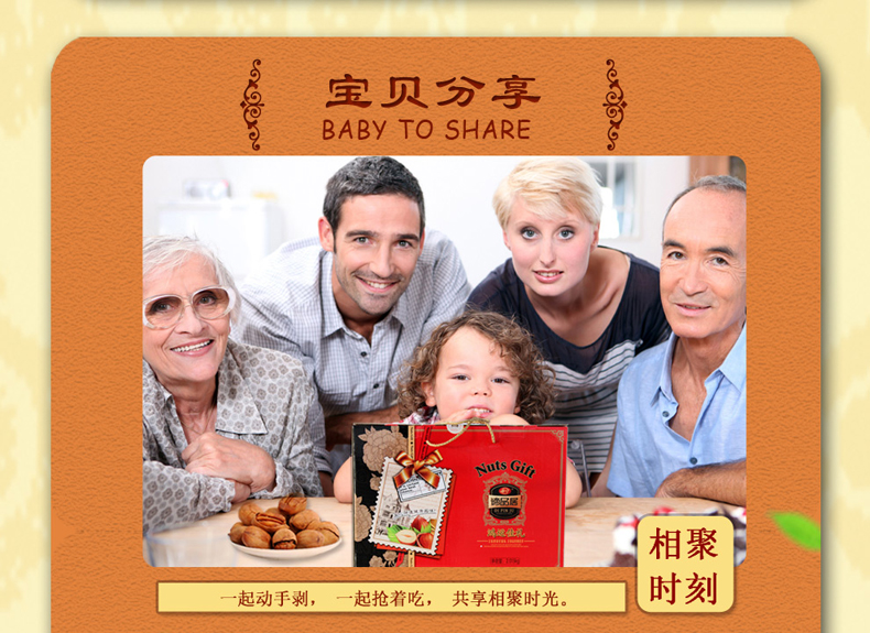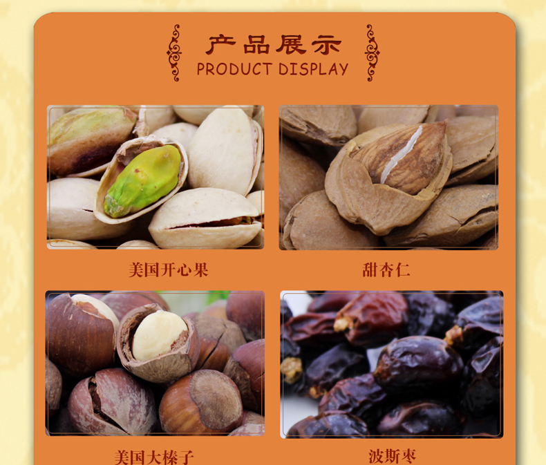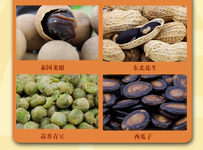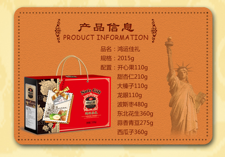 | 内配: | 美国开心果110g, 美国大榛子110g, 甜杏仁210g, 泰国龙眼110g , 波斯枣480g, 东北花生360g, 蒜香青豆275g, 西瓜子360g, |