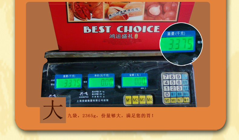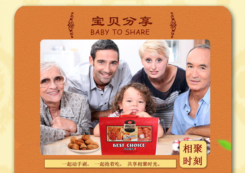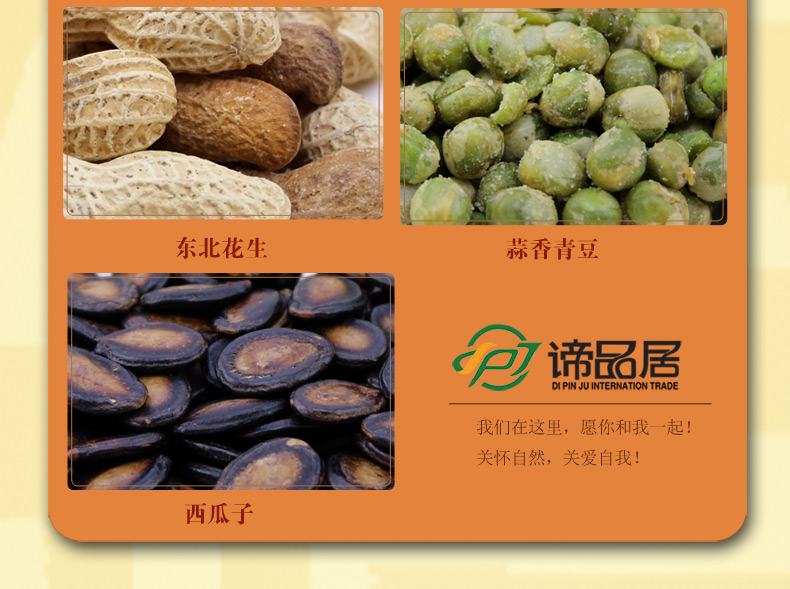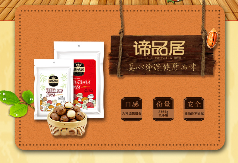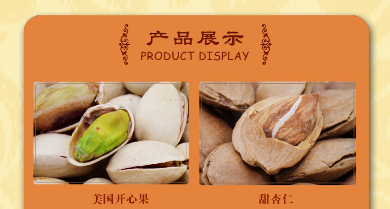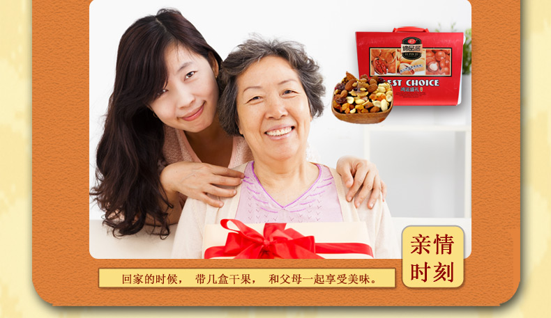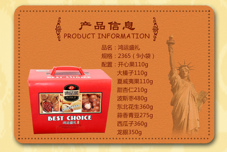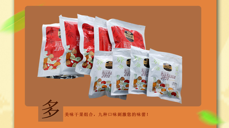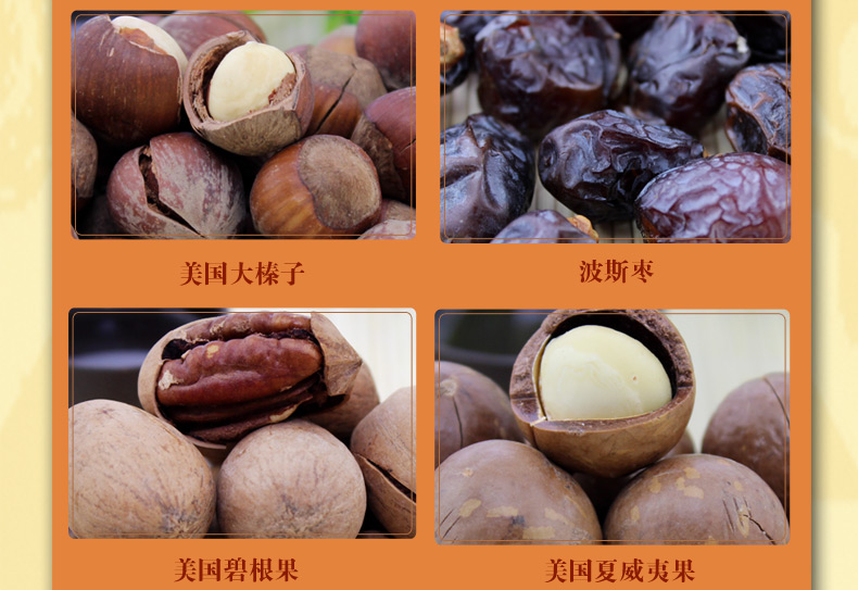 | 内配: | 美国开心果110g, 美国大榛子110g、 美国夏威夷110g, 甜杏仁210g, 波斯枣480g, 东北花生360g, 蒜香青豆275g, 西瓜子360g, 泰国龙眼350g, |