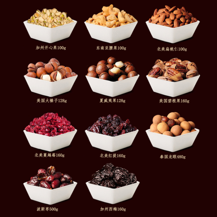 | 内配: | 加州开心果 100 东南亚腰果 100 北美扁桃仁 100 美国大榛子 128 夏威夷果 128 美国碧根果 160 北美蔓越莓 160 北美红提 160 泰国龙眼 480 波斯枣 500 加州西梅 160 |