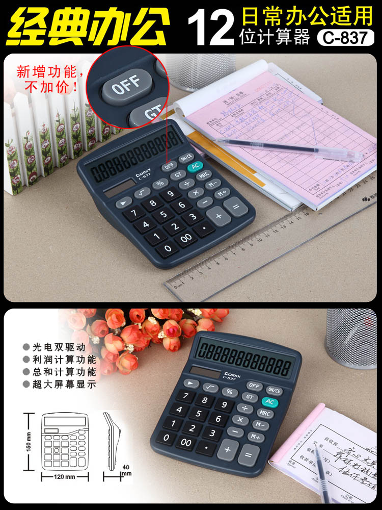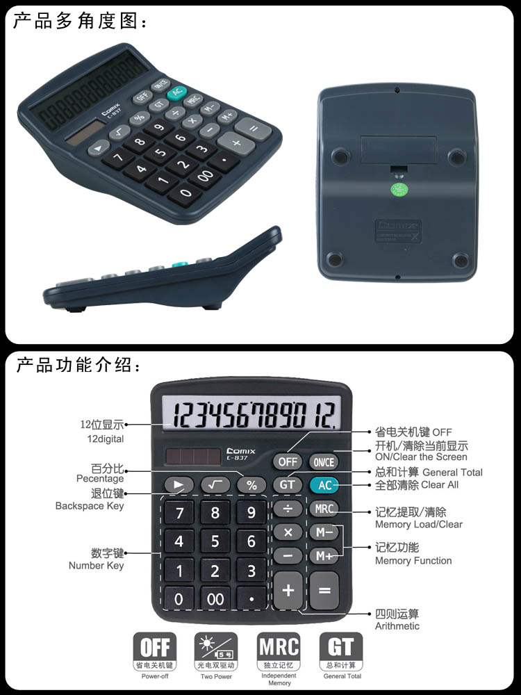 ★ 经典造型、超大屏幕显示 ★ 新增关机键,增加功能不加价 ★ 双重电源、使用更持久 ★总和计算、退位键、独立记忆功能 类型:经典办公桌面型计算器 规格:150*120*40mm 净重:0.1385kg 附带电池 5号电池*1节 |
