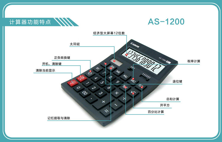 独特弧形机身设计、太阳能及电池供电、四舍五入调节键、小数点预设调节键、退位按键、利率和税率计算、正负数转换计算、总计求和键、百分比计算、根号计算