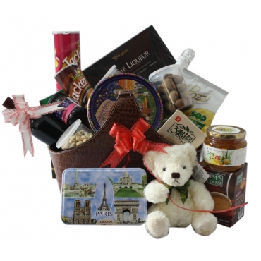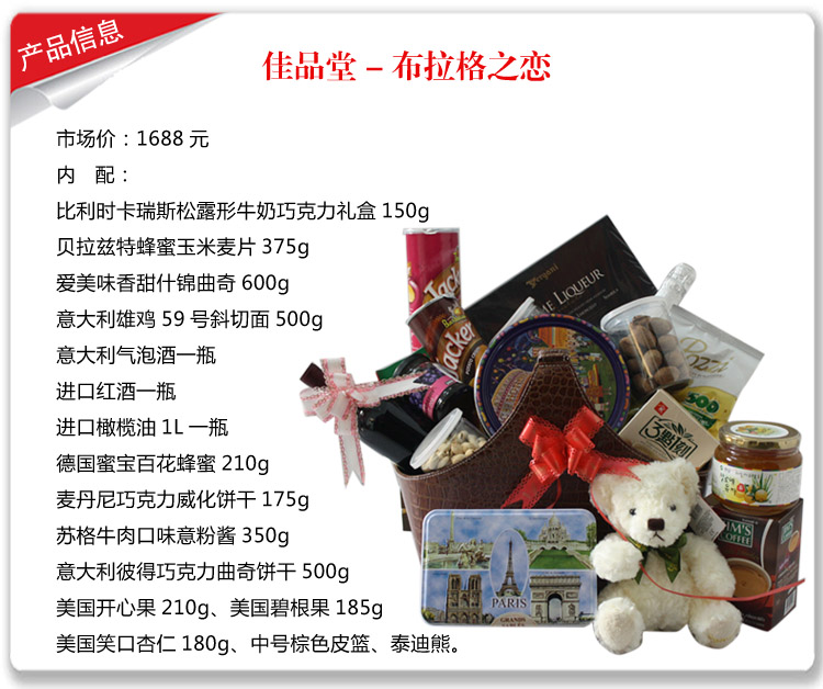 | 内配: | 意大利气泡酒一瓶、进口红酒一瓶、进口橄榄油1L一瓶、爱美味香甜什锦曲奇600g、375g贝拉兹特蜂蜜玉米麦片、比利时卡瑞斯松露形牛奶巧克力礼盒150g、意大利雄鸡59号斜切面500g、苏格牛肉口味意粉酱350g、德国蜜宝百花蜂蜜210g、麦丹尼巧克力威化饼干175g、意大利彼得巧克力曲奇饼干500g、美国开心果210g、美国碧根果185g、美国笑口杏仁180g、中号棕色皮篮、泰迪熊。 |