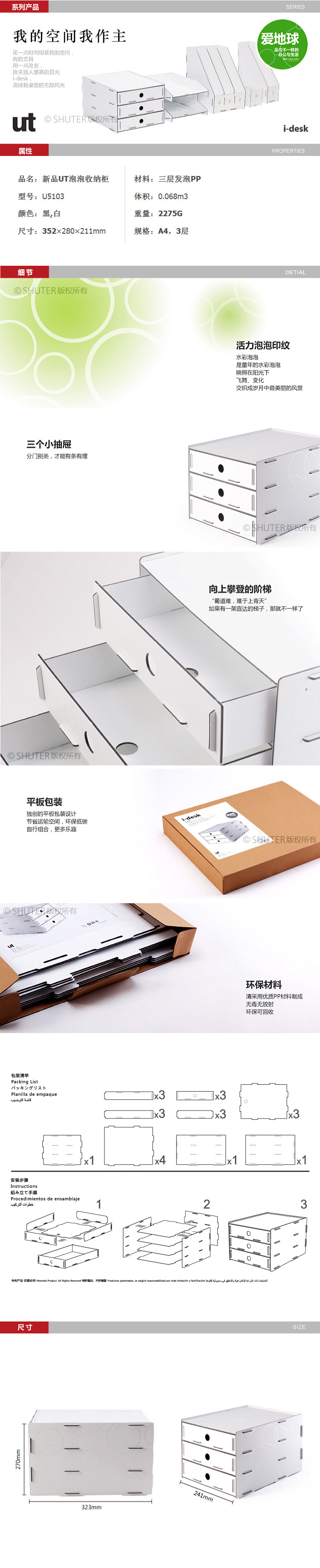 树德(shuter) U5103 IDESK三层文件柜 UT材料 高档办公用品 白色