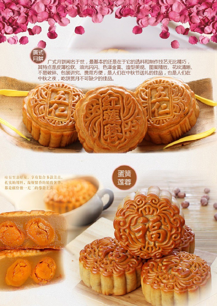 口味配置:110g*4 (莲蓉蛋黄、南瓜蛋黄、豆蓉蛋黄、杏蓉蛋黄)