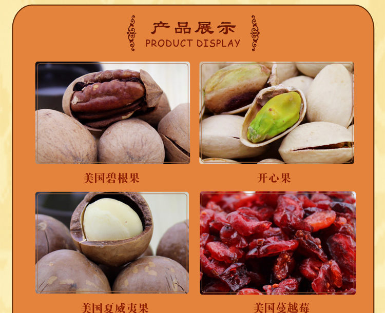 | 内配: | 巴西松子150g 美国开心果160g 美国碧根果170g 美国夏威夷果200g 加州西梅280g 美国蔓越莓220g 美国大榛子180g 炭烧腰果180g 波斯枣200g 智利黑提238g 泰国芒果干200g 鲍鱼果150g |